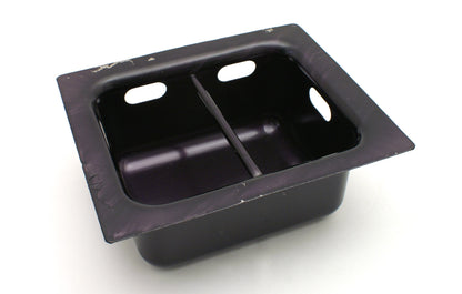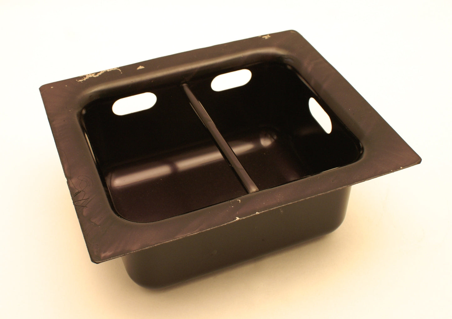 Square ash pan including crossbar for easy removal and transport of the ash.