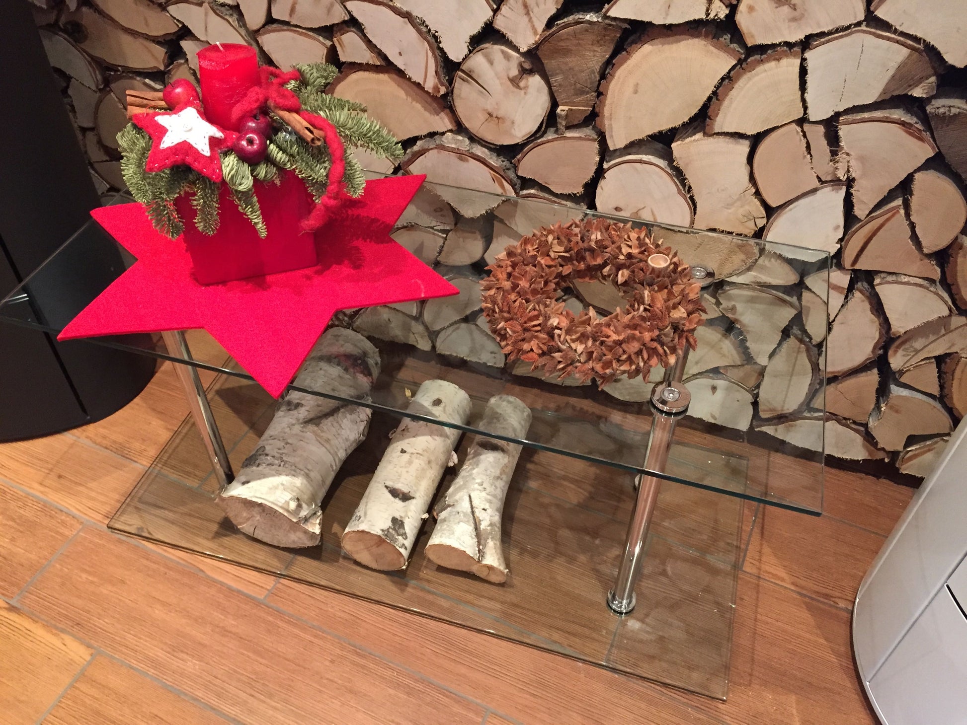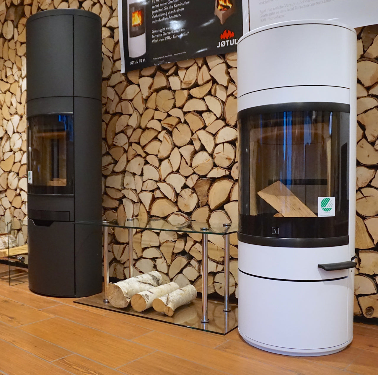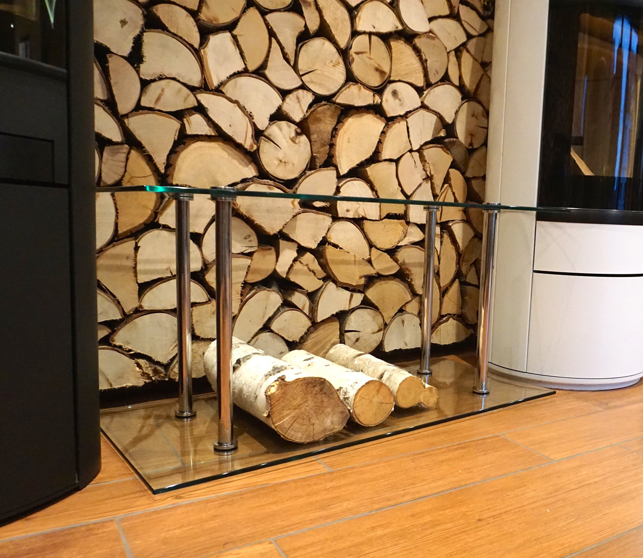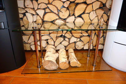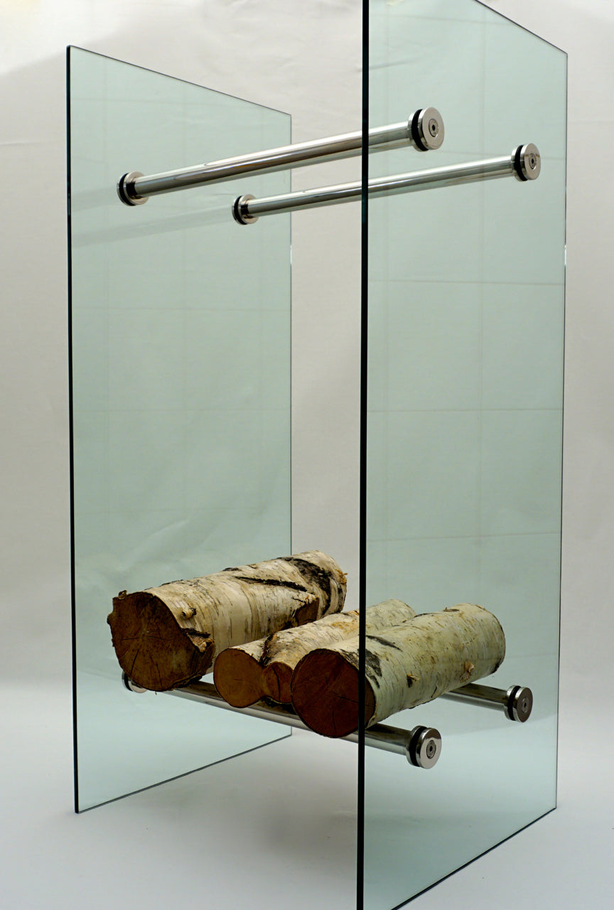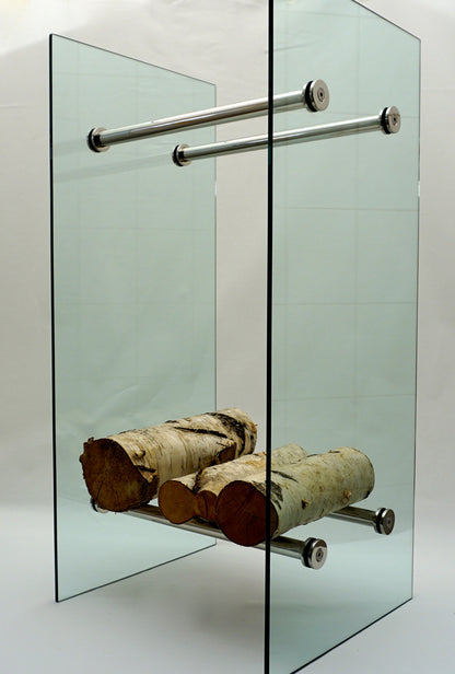 Wooden storage containers in a modern design for your living room. Store your firewood stylishly and elegantly in the glass wood container.