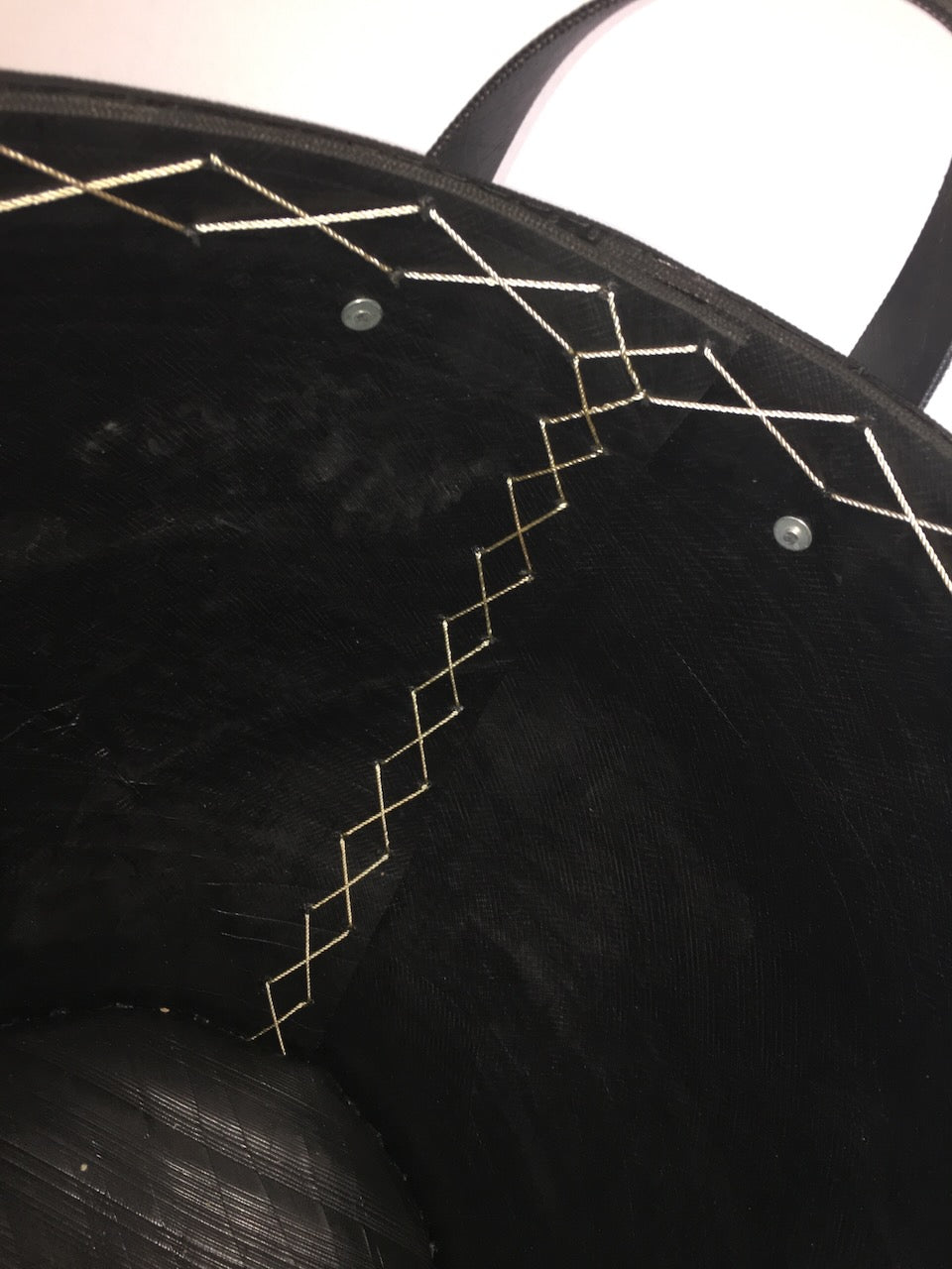 - Disain: Kõhukas kuju valgete ristõmblustega ja kandekäepidemetega