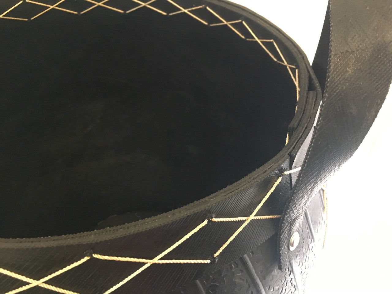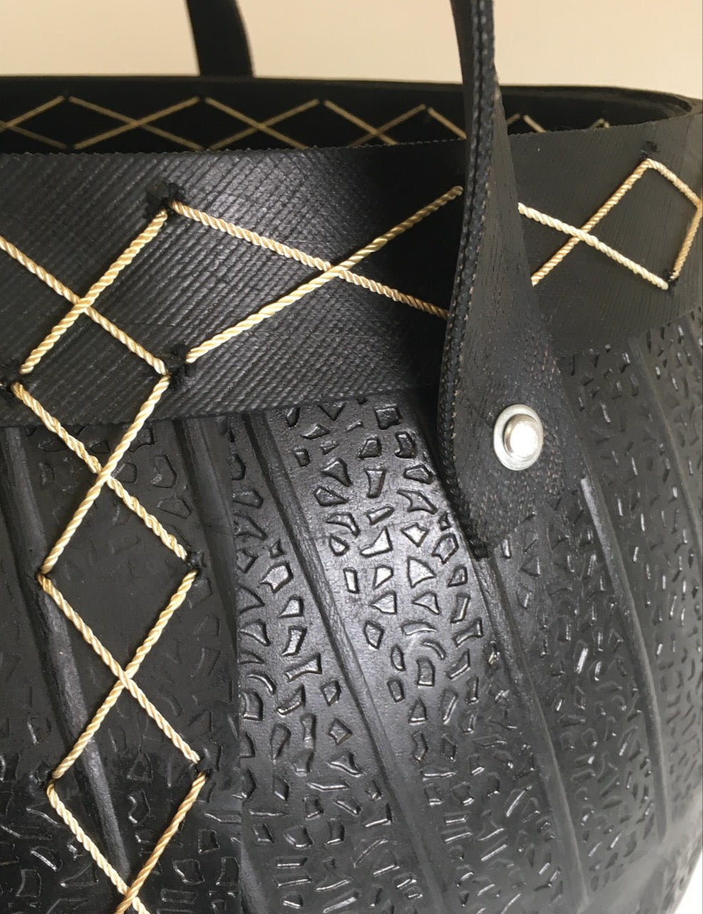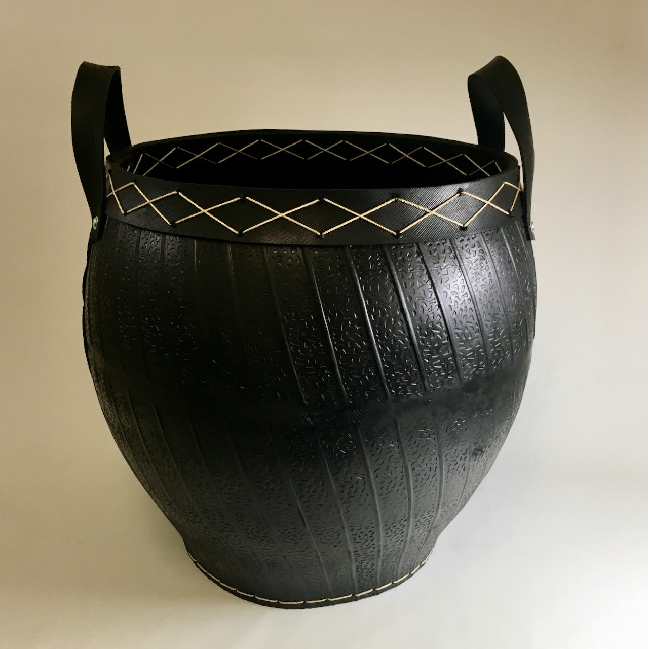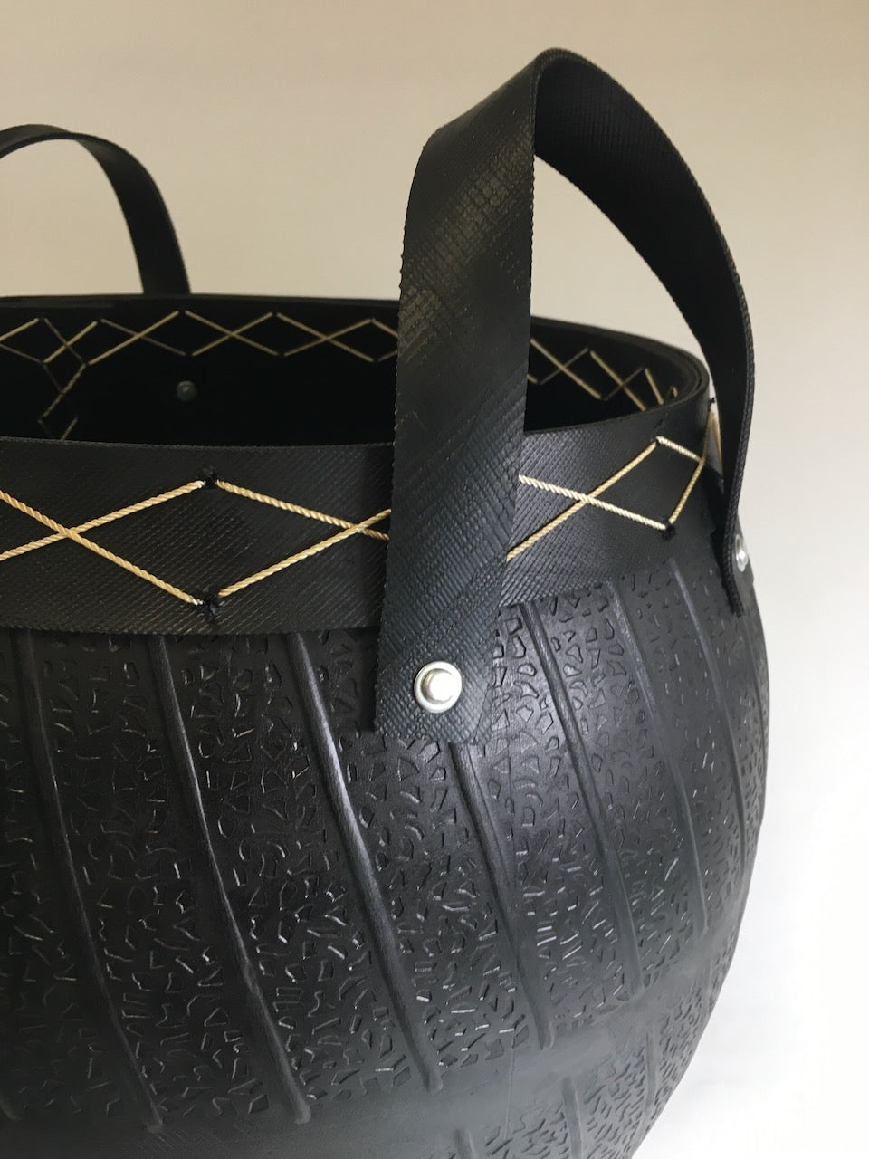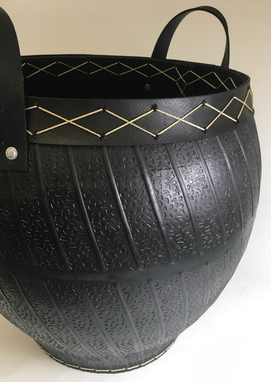 Jätkusuutlik puukorv taaskasutatud kummist – 45 cm kõrge, dekoratiivsete õmbluste ja sangadega