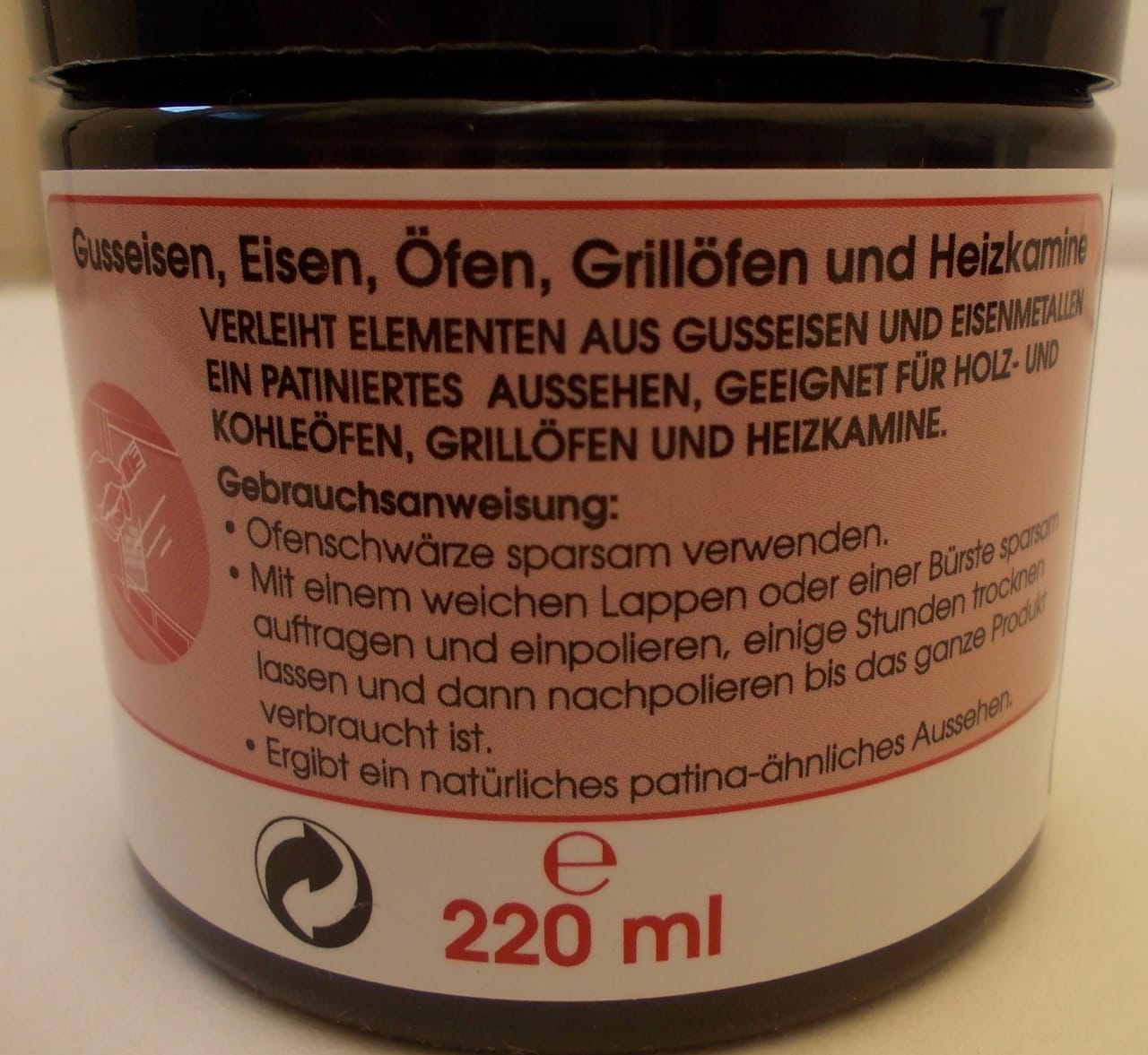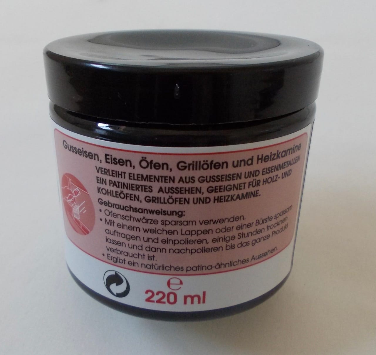 Les métaux devenus inesthétiques, comme les plaques de cuisson, les fours, les tuyaux de poêle, les plaques de cheminée ou d'autres pièces de machines, peuvent être à nouveau colorés en noir profond à l'aide du noir du four . Il protège également les plaques en fonte, les cheminées ou les barbecues de jardin de la rouille.