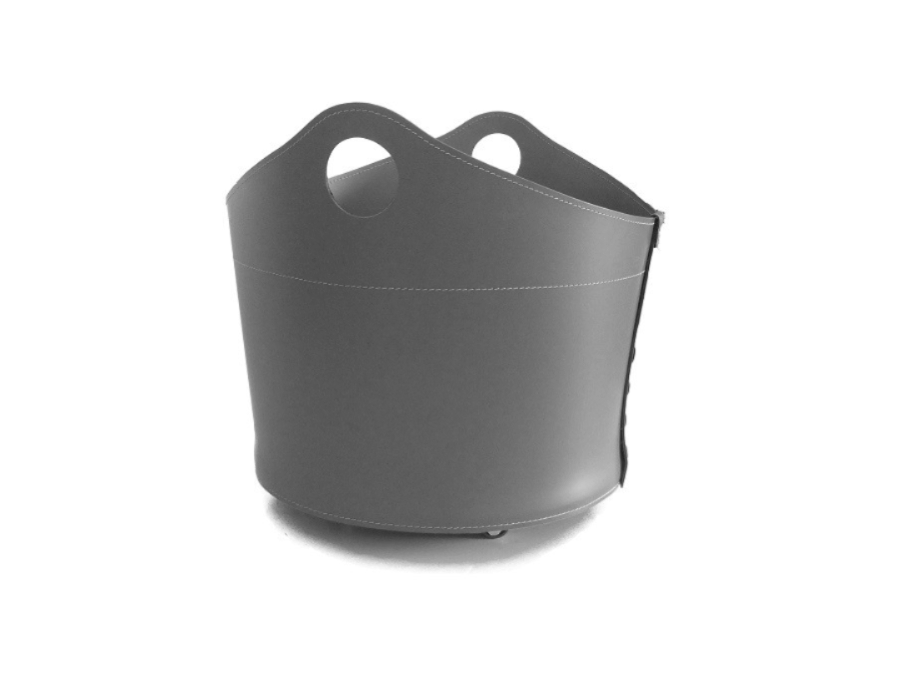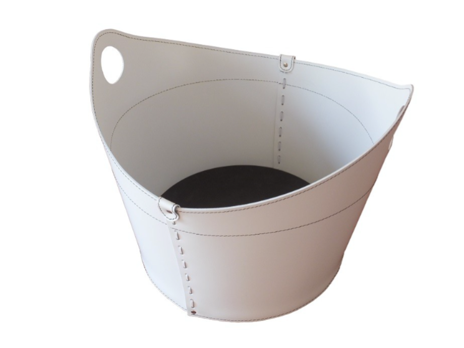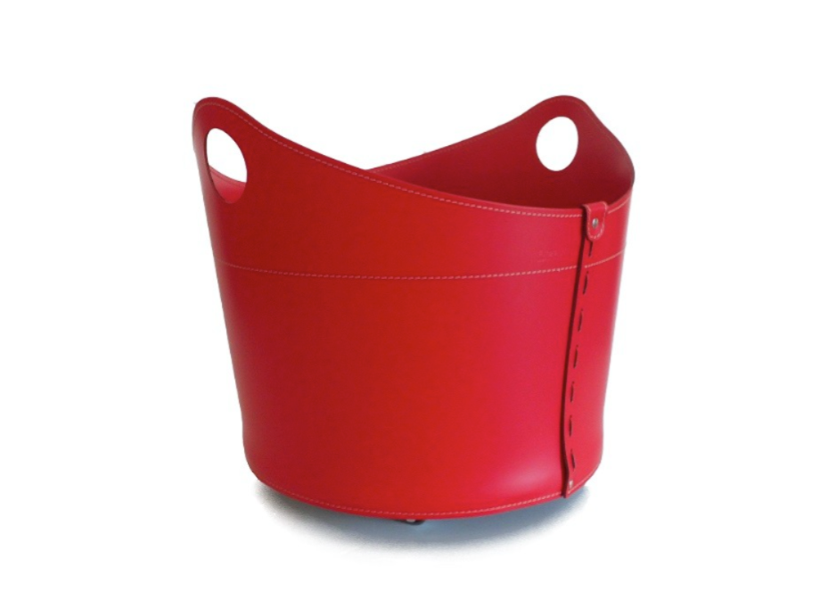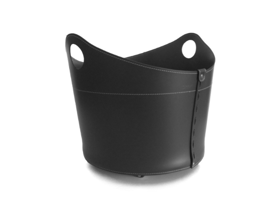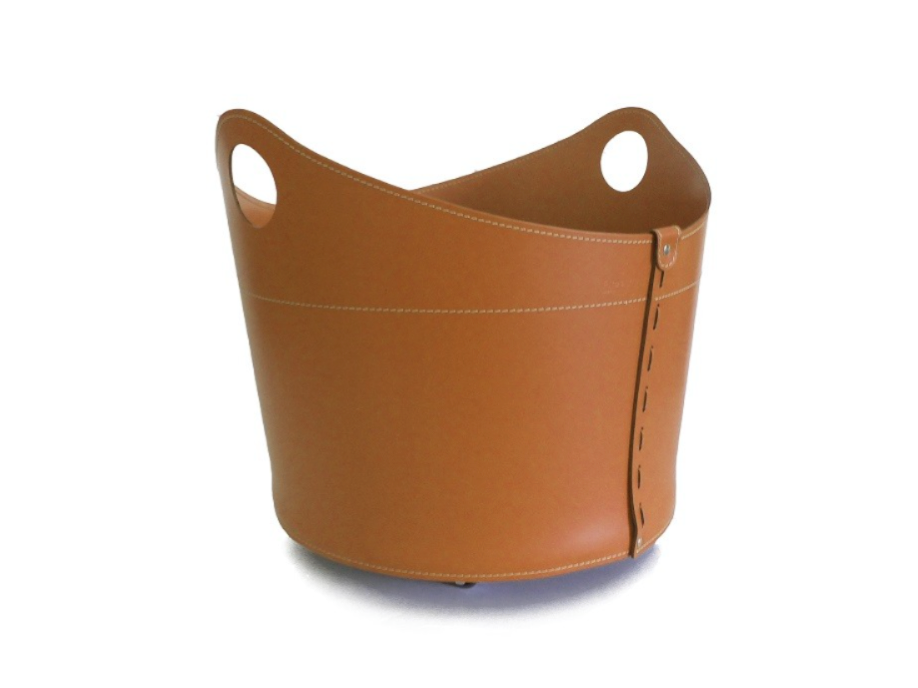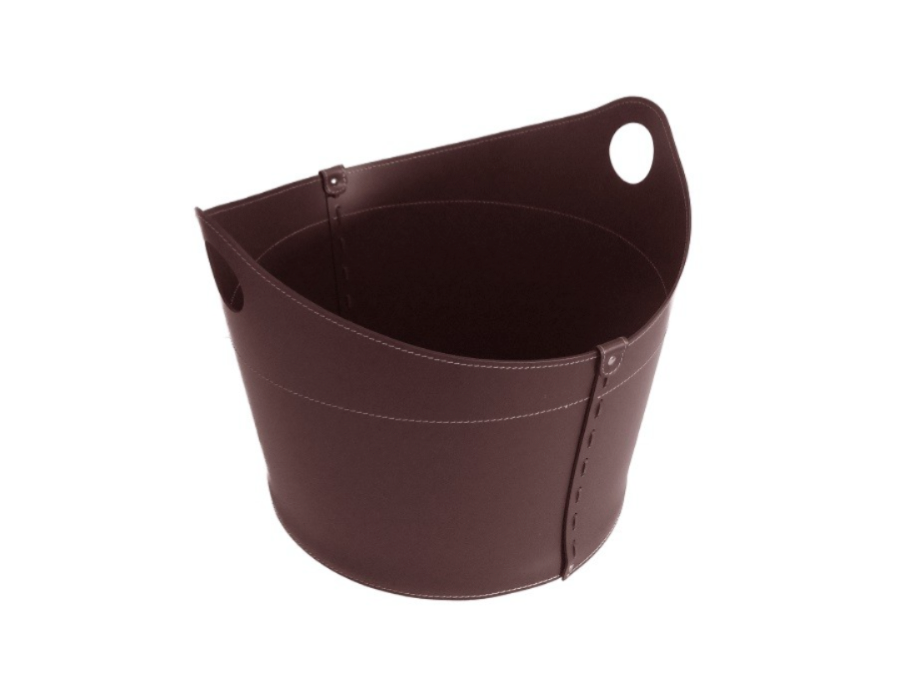 Un capiente cesto portalegna in vera pelle italiana per riporre la legna da ardere o altri oggetti come giornali o giocattoli.
