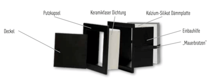 Kapsuła czyszcząca jest idealna do tynkowania lub do wklejania indywidualnych wkładek z ceramiki lub kamienia. Tuleja czyszcząca jest masywna, stabilna i wykonana z wysokiej jakości proszkowo malowanej stali, mimo to jej wygląd jest delikatny. Tuleja czyszcząca wyposażona jest w uszczelkę z włókna ceramicznego oraz wewnętrzną płytę izolacyjną. Zamknięcie jest precyzyjnie dopasowane, co zapewnia bardzo dobrą szczelność.
