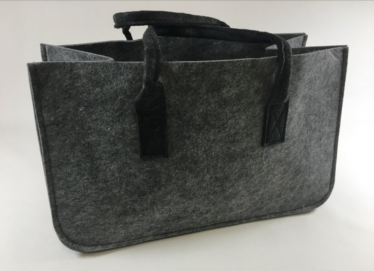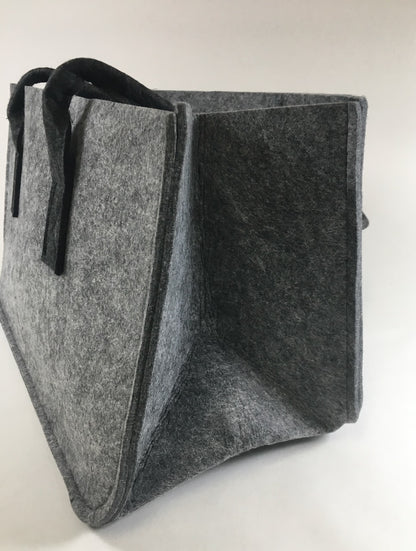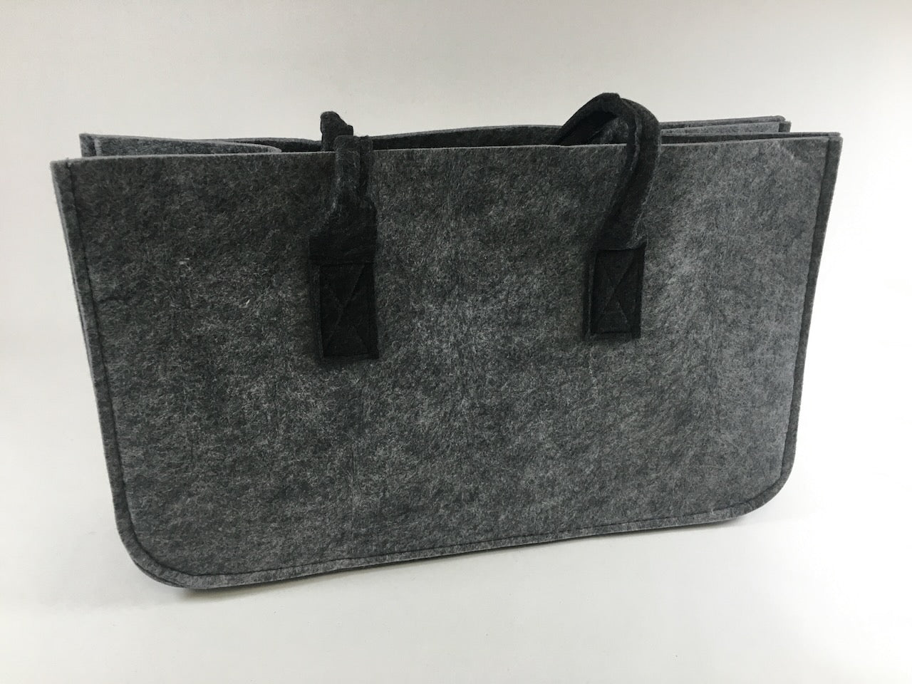 Elegancka jasnoszara torba filcowa z ciemnoszarym uchwytem na drewno kominkowe. Łatwa do przenoszenia i nic się nie wysypuje.