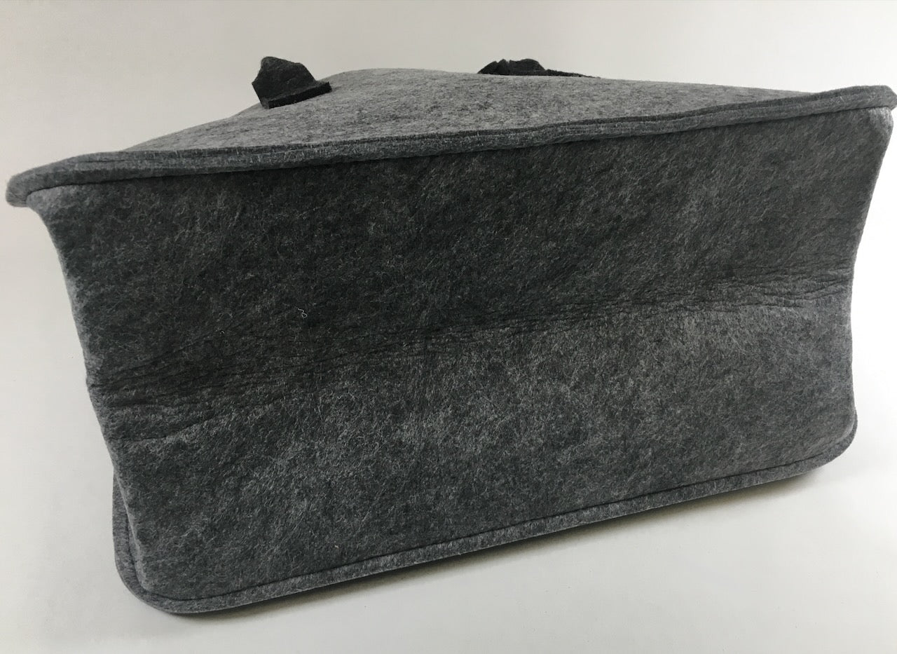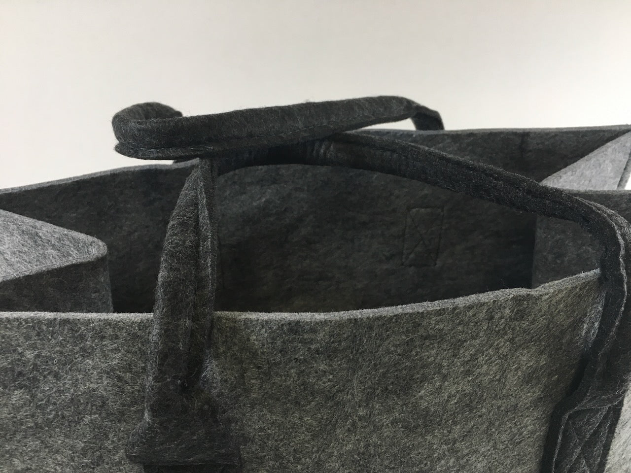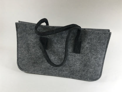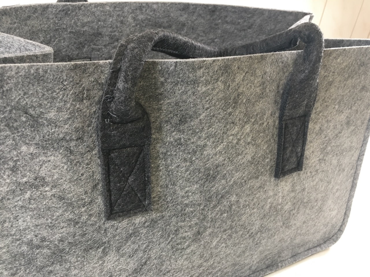 Elegancka jasnoszara torba filcowa z ciemnoszarym uchwytem na drewno kominkowe. Łatwa do przenoszenia i nic się nie wysypuje.
